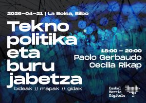 Nola berreraiki botere publikoa plataforma digitalen nagusitasunaren aurrean? Nola hautsi teknologia-konpainia handiekiko mendekotasun-kateak? Nola eraman praktikara gure erakundeetan burujabetza teknologikoaren agenda teknopolitikoa? Galdera hauek eta beste batzuk izango dira ardatz apirilaren 21ean Bilbon egingo den jardunaldian, teknopolitikaren eta burujabetza digitalaren inguruko bi ikuspegi kritiko elkarrekin jartzeko aukera eskainiko duena. Paolo Gerbaudok eta Cecilia Rikapek Recuperar … Irakurtzen jarraitu Teknopolitika eta burujabetza uztartzeko bideak, mapak, gidak